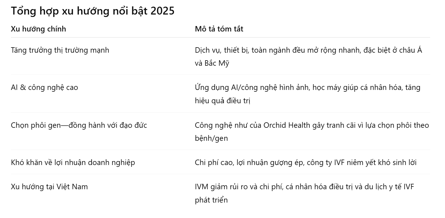 • Mặc dù nhu cầu tăng (vì sinh con muộn), các công ty IVF niêm yết công khai như Monash IVF, Vitrolife, Jinxin Fertility lại gặp khó khăn: giá cổ phiếu giảm mạnh, chi phí cao, lợi nhuận thấp Financial Times.